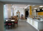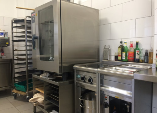 Um den Ansprüchen an eine moderne Küchentechnik gerecht zu werden, wurde hinter dem Thekenbereich eine Zubereitungsküche eingerichtet,